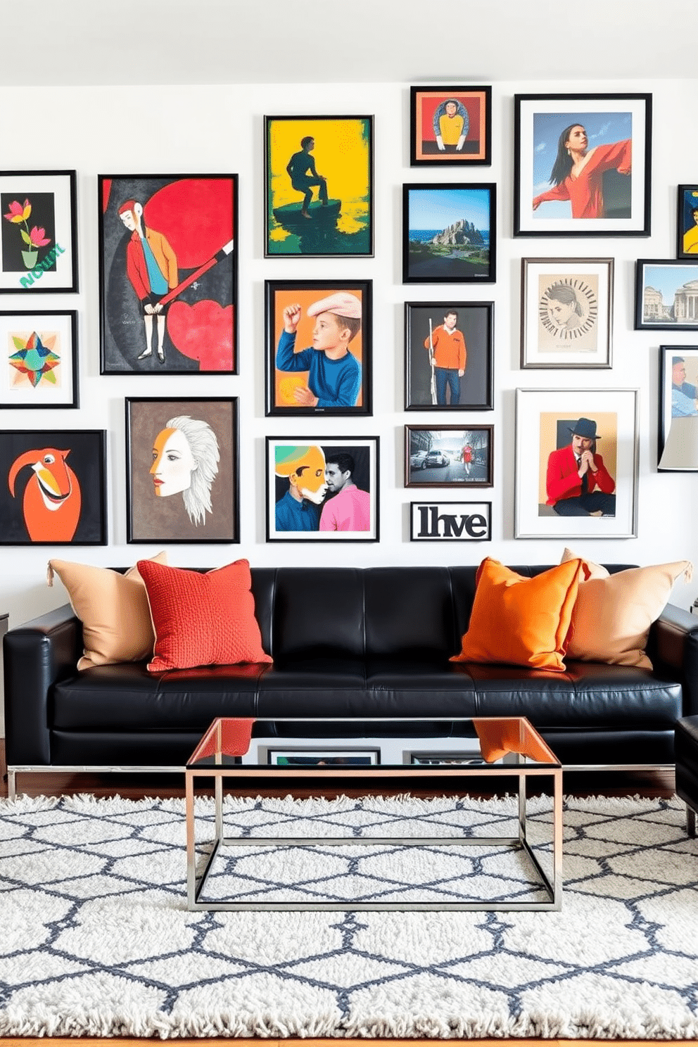 A modern art gallery wall spans above a sleek black couch, showcasing an eclectic mix of vibrant abstract paintings and framed photographs in various sizes. The wall is painted in a soft white to enhance the colors of the artwork, while the couch is adorned with textured throw pillows in bold hues.