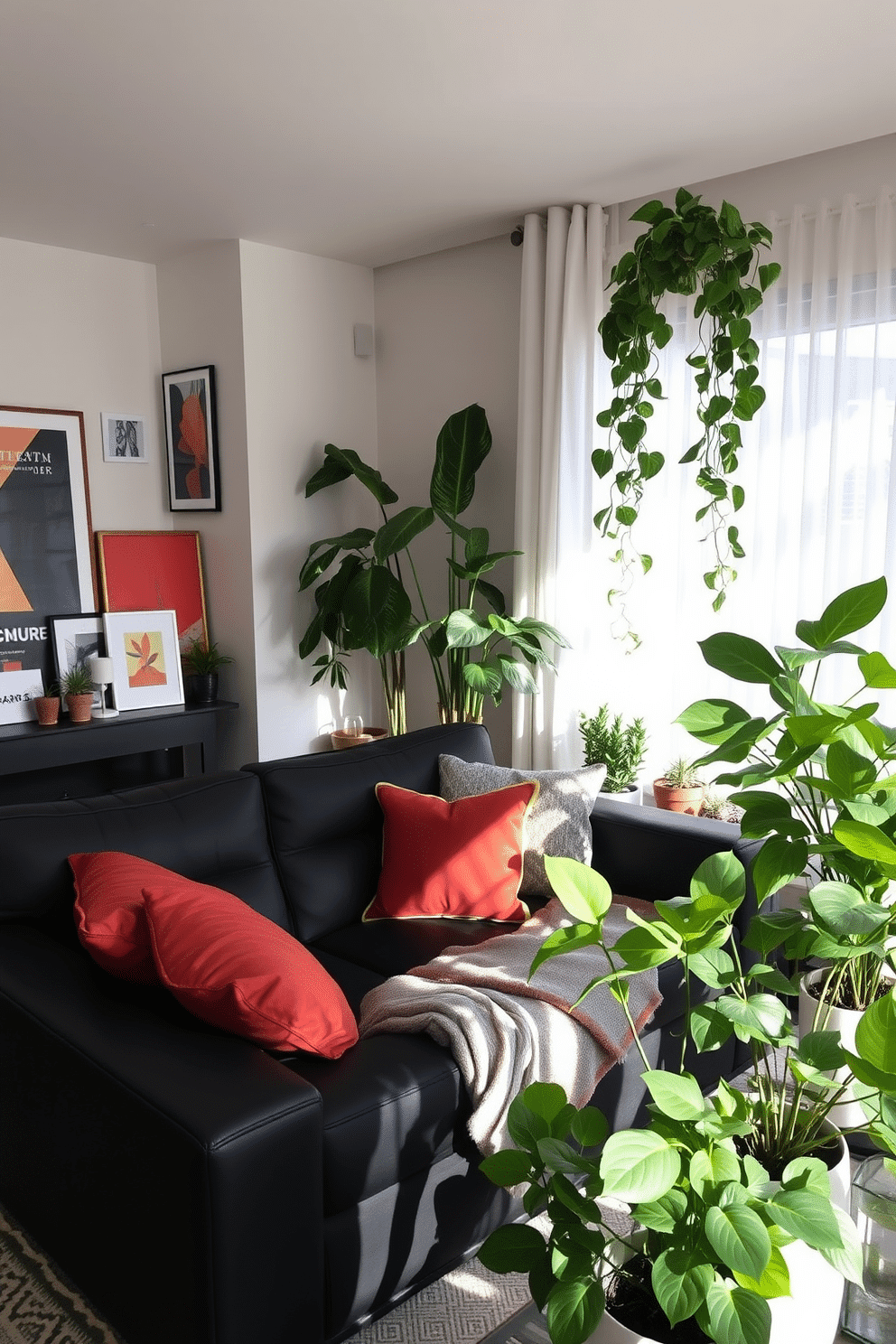 Accentuate the black couch with an array of patterned throw pillows in rich hues, creating a striking contrast against the dark fabric. A stylish coffee table sits in front, topped with a few art books and a decorative tray, inviting relaxation and conversation in this inviting setting.