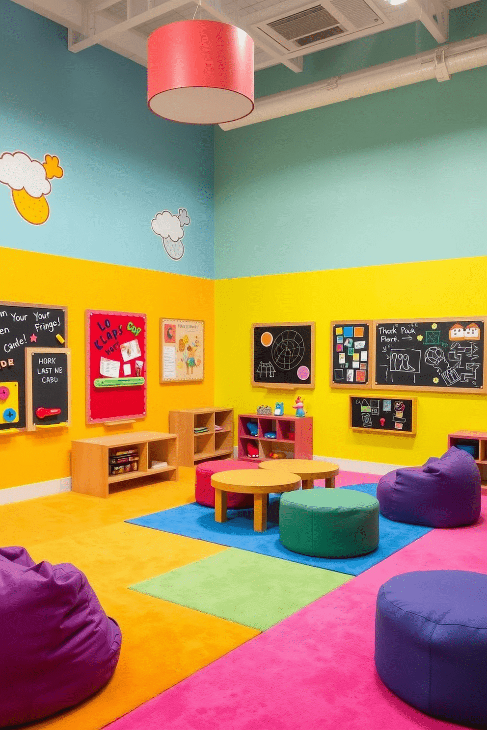 In one corner, a large black chalkboard allows for creative expression, surrounded by colorful storage bins filled with toys. Brightly colored bean bags and cushions are scattered throughout the space, providing cozy spots for relaxation and play.