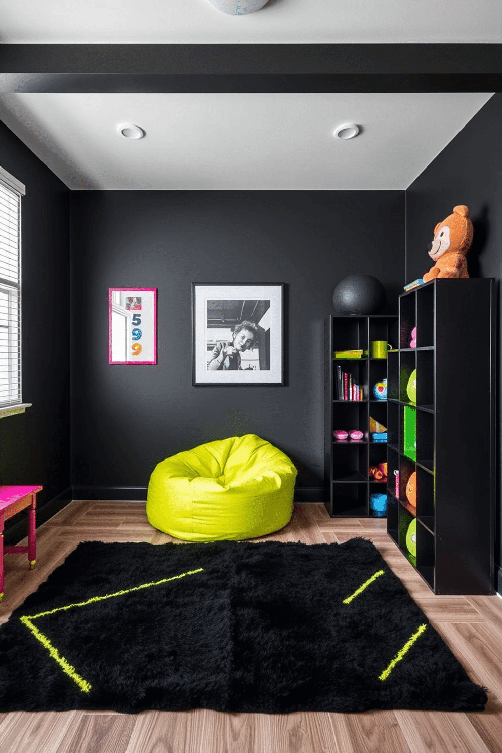 In one corner, a neon green bean bag chair invites relaxation, while a black modular shelving unit showcases colorful toys and books. The floor features a soft, plush black rug with neon geometric patterns, adding a playful touch to the space.