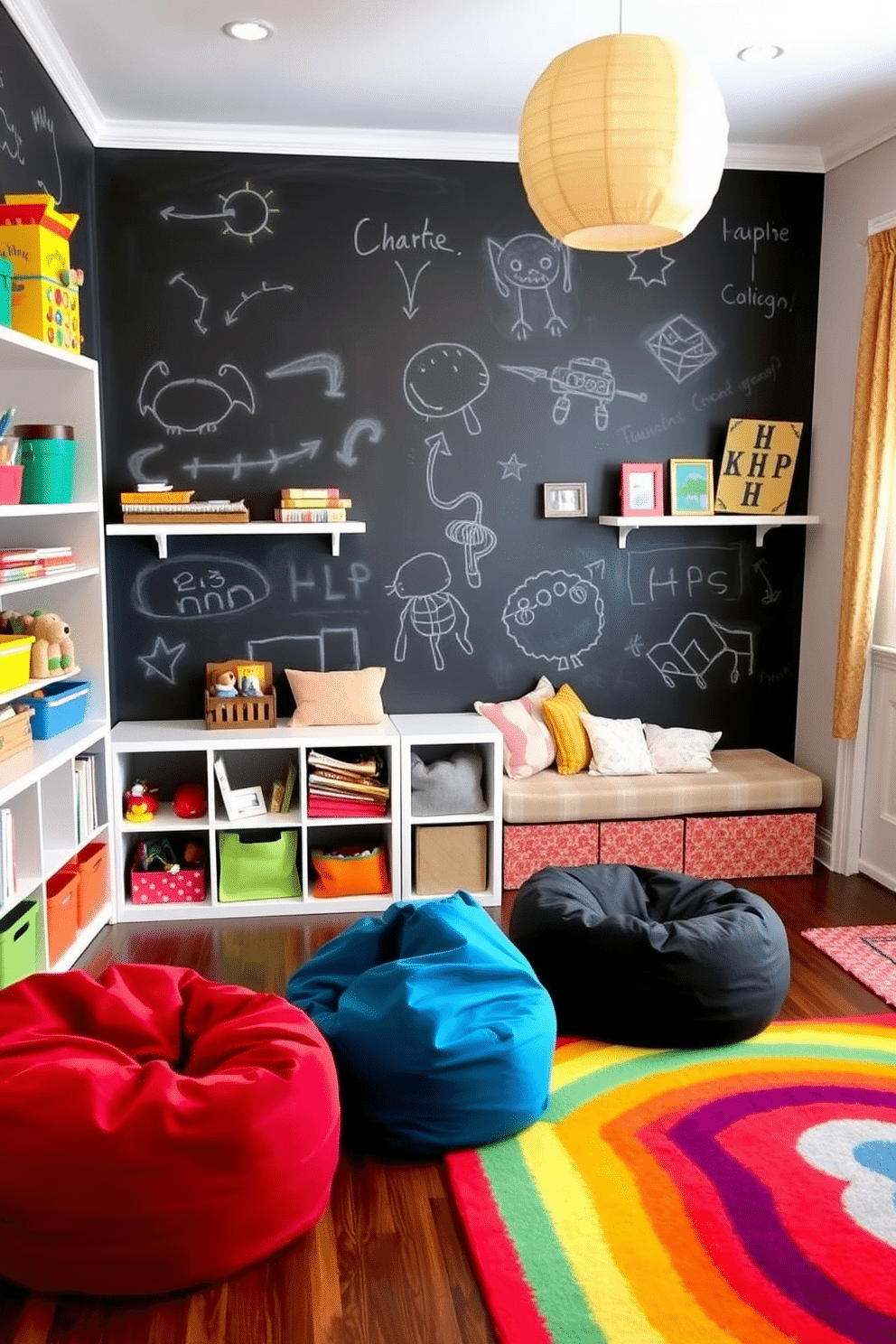 In one corner, a vibrant area rug adds warmth and comfort, contrasting beautifully with the dark chalkboard surface. Fun, oversized bean bags provide flexible seating options, making the space both functional and inviting for playdates.