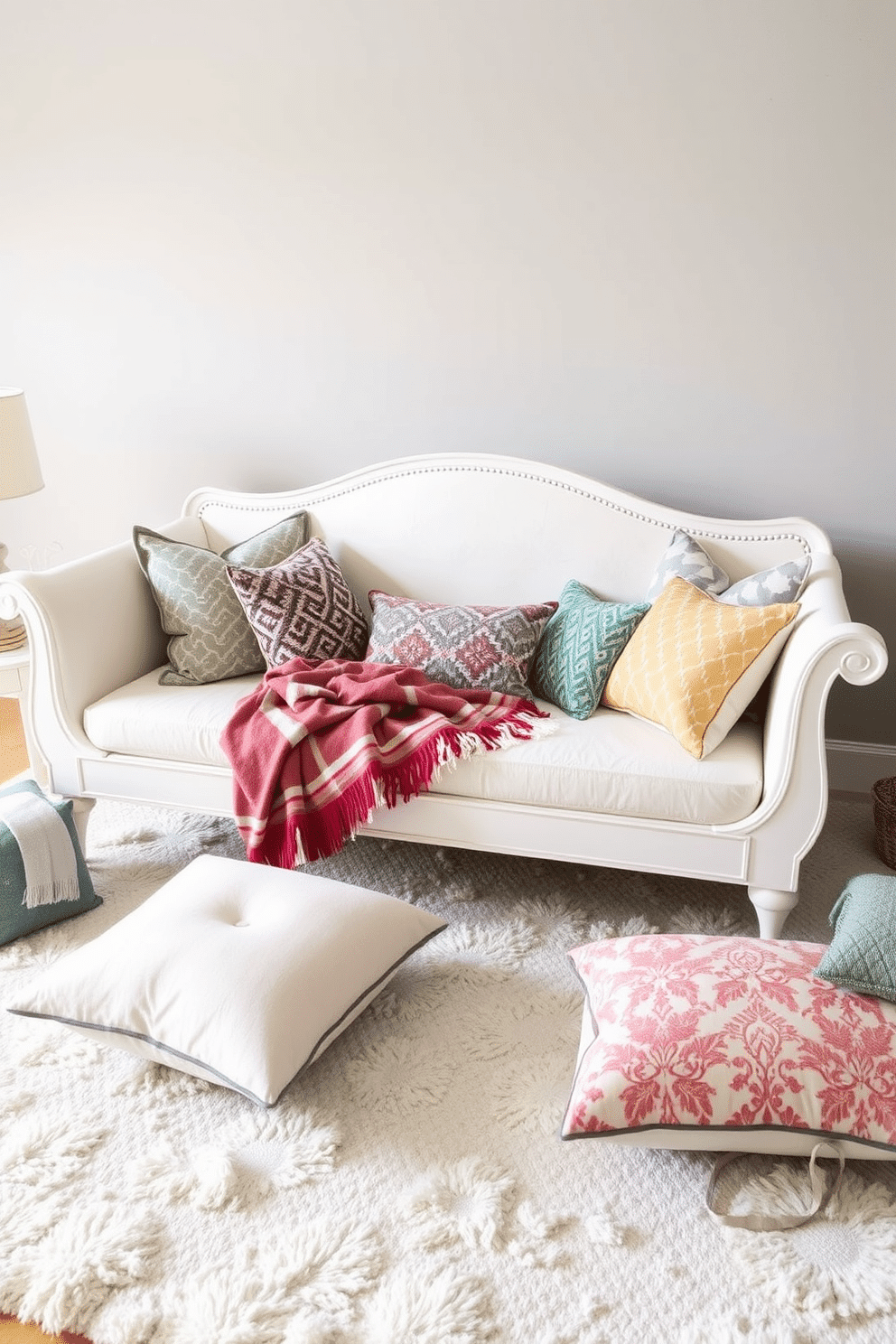 A vintage-inspired daybed adorned with vibrant floral prints takes center stage in a cozy living room. Surrounding the daybed are soft, pastel-colored cushions that enhance the inviting atmosphere, while a delicate lace throw drapes elegantly over one side.