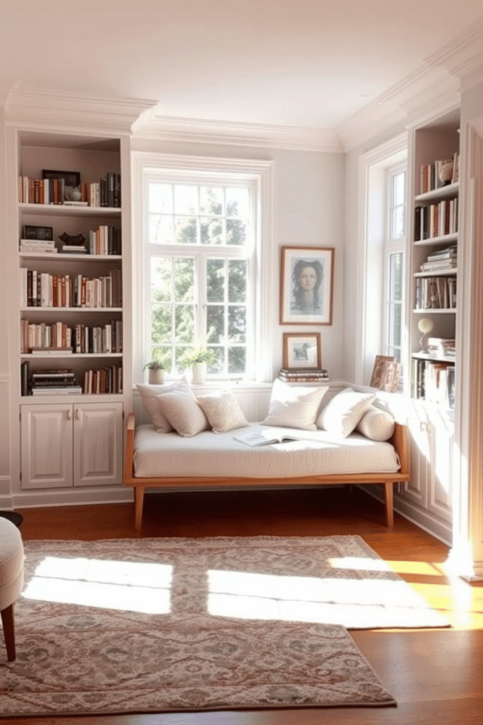 A cozy daybed is nestled in the corner of a bright living room, surrounded by built-in shelves filled with an array of books and decorative items. The daybed features plush cushions in soft pastel colors, creating an inviting space for reading or relaxing.