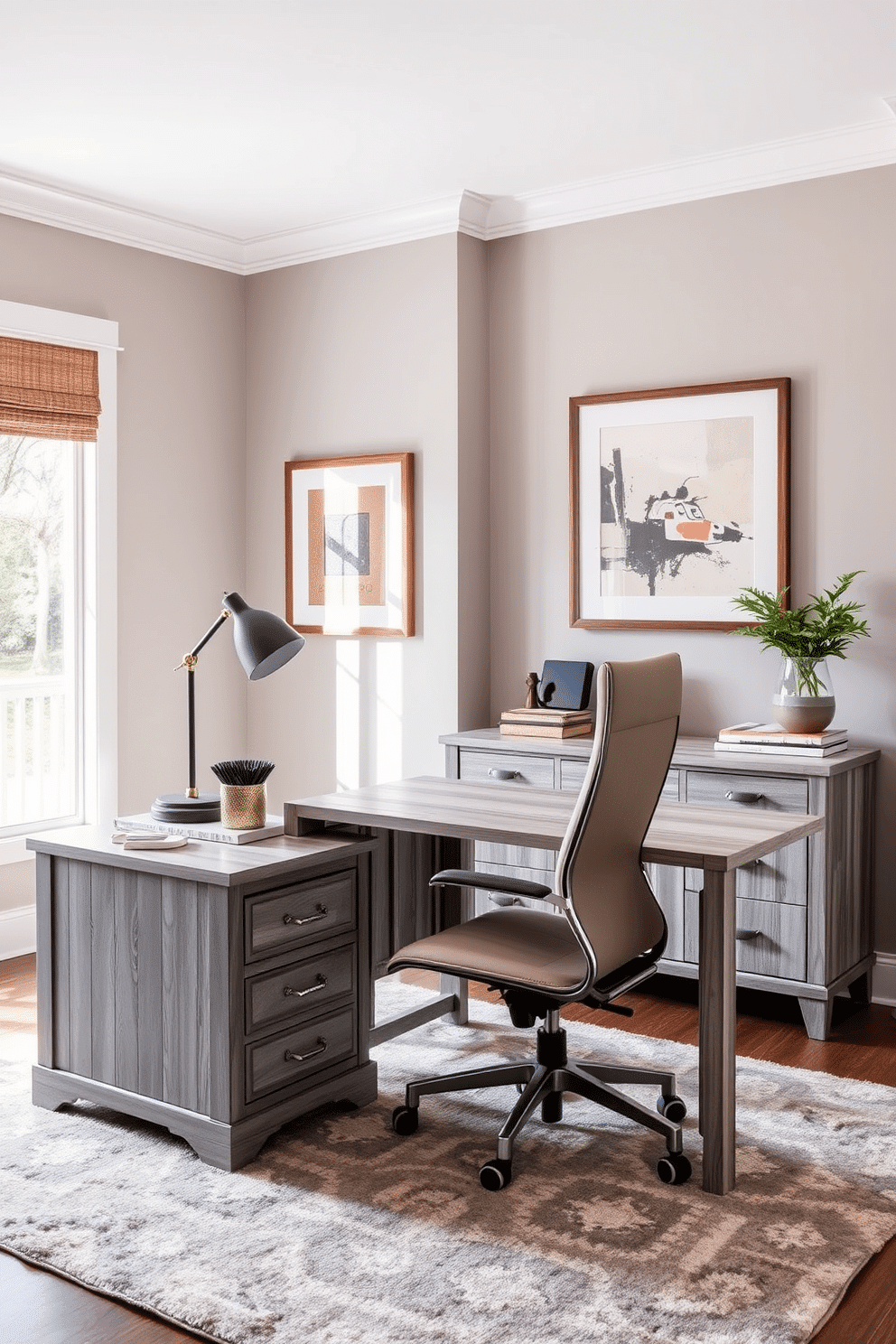 A sophisticated home office featuring a gray color palette complemented by neutral tones. The room includes a sleek gray desk with a minimalist design, paired with a comfortable beige ergonomic chair.