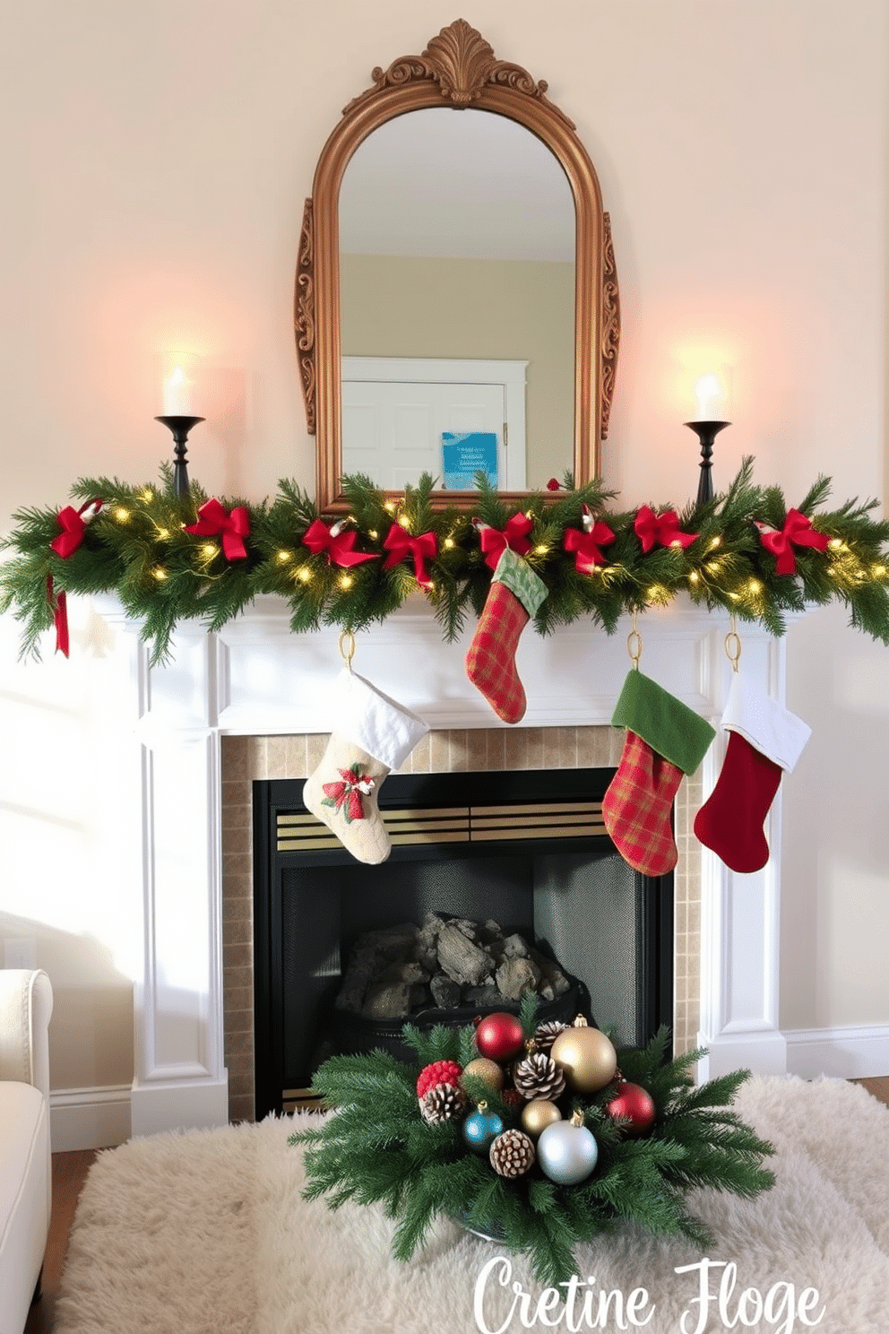 Above the mantel, a beautifully framed mirror reflects the warm glow of candles placed on either side. The fireplace is surrounded by a soft, plush rug, and a festive centerpiece of pinecones and ornaments adds a cheerful touch.