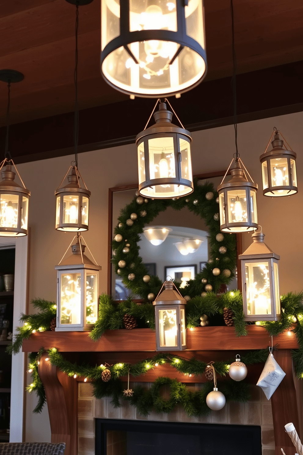 A cozy living room adorned with farmhouse-style lanterns hanging from the ceiling, each filled with warm fairy lights that create a magical ambiance. The rustic wooden mantel is beautifully decorated for Christmas, featuring evergreen garlands, pinecones, and a collection of festive ornaments that add a touch of holiday cheer.