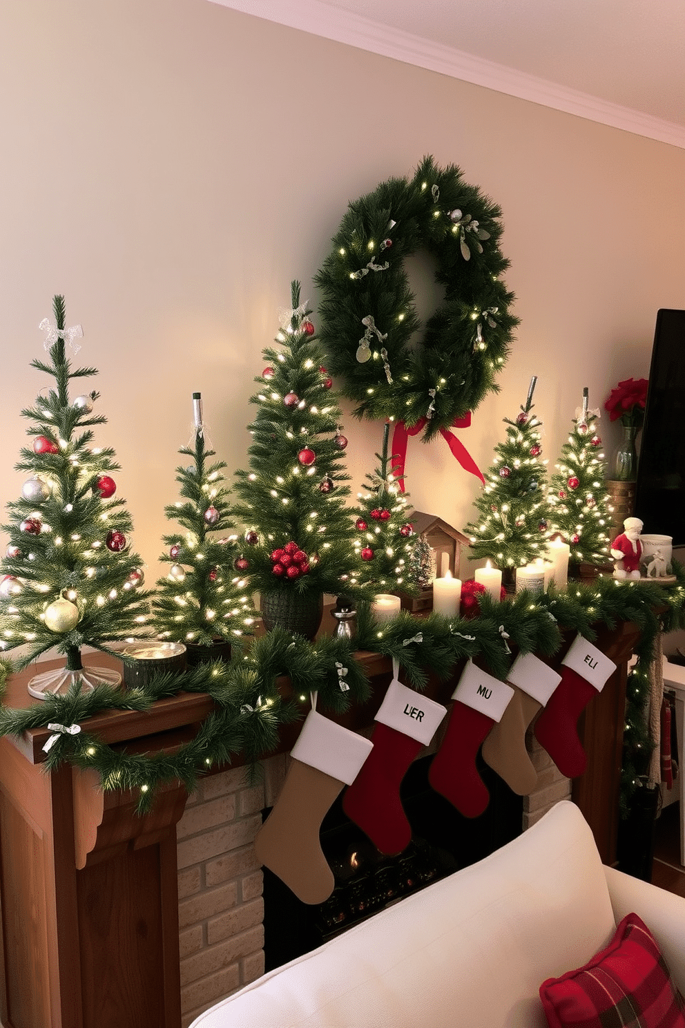A cozy living room adorned with miniature Christmas trees in varied heights, each decorated with twinkling fairy lights and colorful ornaments. The trees are strategically placed on a rustic wooden mantel, which is draped with garlands of pine and accented with festive candles and seasonal decorations.