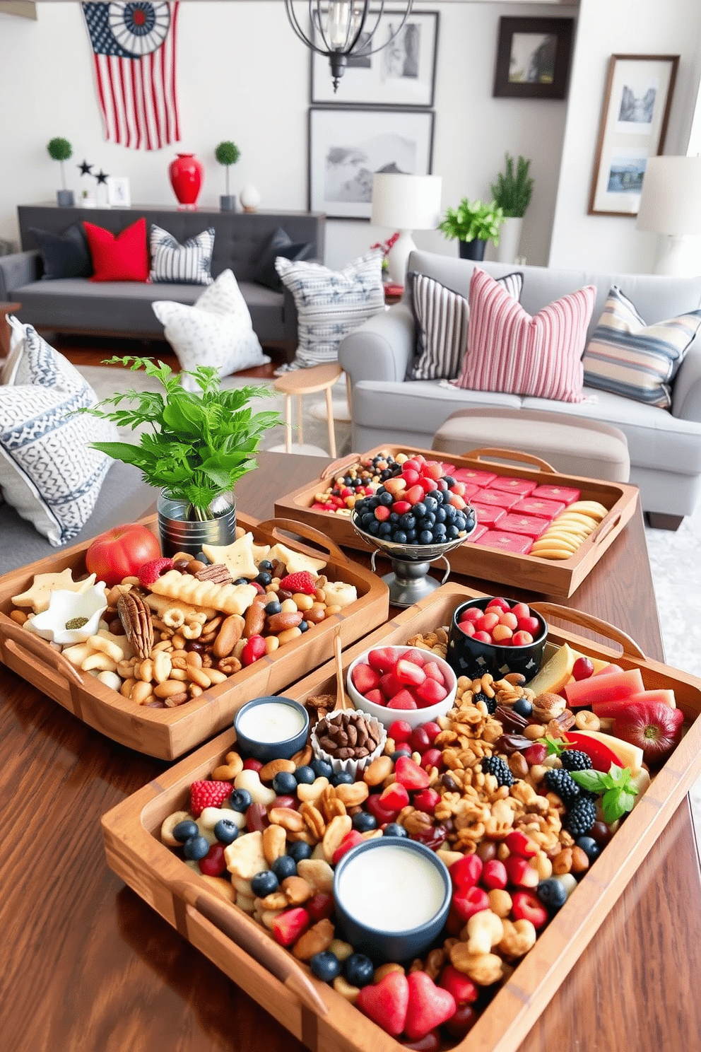 A stylish arrangement of decorative trays filled with seasonal snacks. The trays are made of natural wood and feature an assortment of colorful fruits, nuts, and artisanal treats, beautifully presented for a festive gathering.