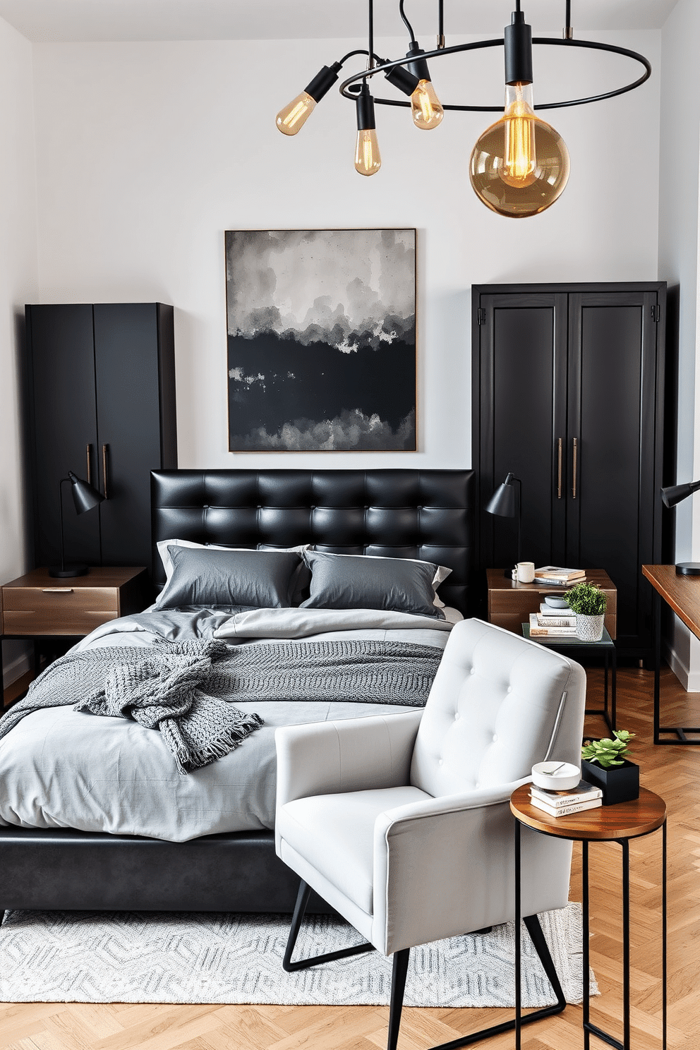 A modern men’s bedroom design exuding sophistication and comfort. The bed features a dark leather headboard complemented by soft, textured gray bedding, with a knitted throw casually draped across the foot of the bed. Industrial metal nightstands with brushed steel surfaces flank the bed, each adorned by sleek black bedside lamps with warm Edison bulbs. A large abstract canvas with muted tones hangs above the bed, tying in shades of gray, black, and deep forest green. A rugged steel wardrobe stands tall in one corner, its sharp edges softened by a plush area rug in neutral tones beneath. A minimalist armchair upholstered in soft velour sits by the window, paired with a small black metal side table showcasing a stack of books and a decorative potted plant. On the opposite wall, a simple desk made of polished wood with black metal legs holds a clean-lined desk lamp and a leather organizer. The setting is tied together with soft lighting from a contemporary chandelier, offering balance between its metal framework and its warm amber glow, creating a welcoming retreat.