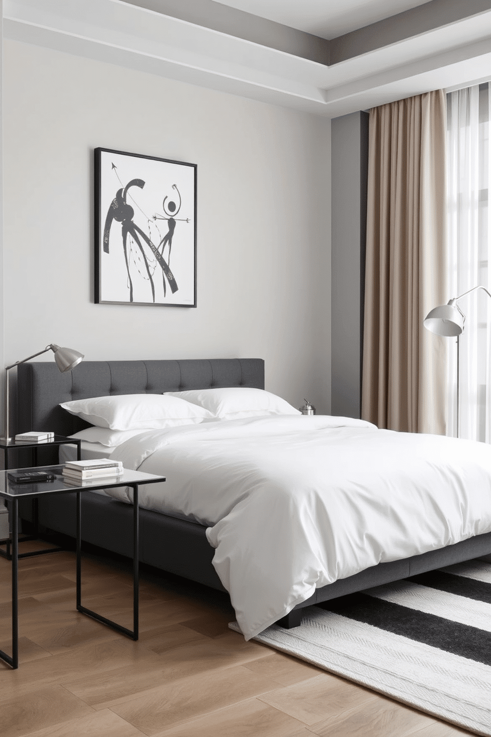 A sleek and contemporary men's bedroom. Neutral tones dominate the space, with soft gray walls and beige curtains framing the room, while a large platform bed with a charcoal upholstered headboard is dressed in crisp white linens. To the side, a minimalist glass desk with black metal legs holds a few neatly stacked books and a small metallic table lamp. Above the bed, an abstract black-and-white painting hangs, while a geometric patterned area rug and a polished chrome floor lamp complete the look.