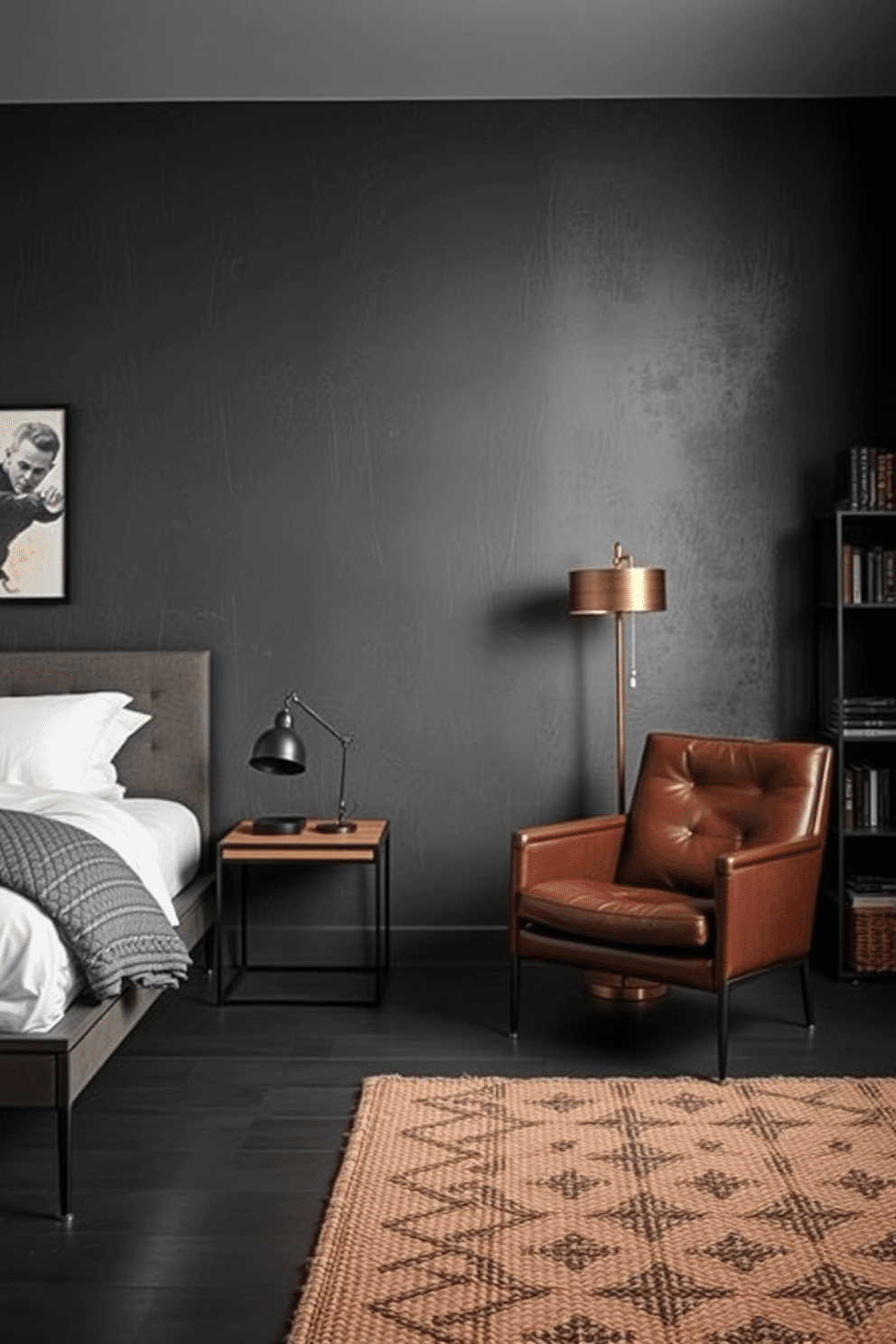 A sleek men's bedroom with textured, dark charcoal walls that add depth and richness to the space. A low-profile platform bed with crisp white bedding sits against the wall, flanked by minimalist black metal side tables with warm wood accents. A vintage leather armchair is placed in the corner, accompanied by a tall brass floor lamp that casts a soft, ambient light. The room is accented with masculine decor elements such as a black-framed abstract art piece, a woven area rug in deep earthy tones, and a collection of books on the shelves.