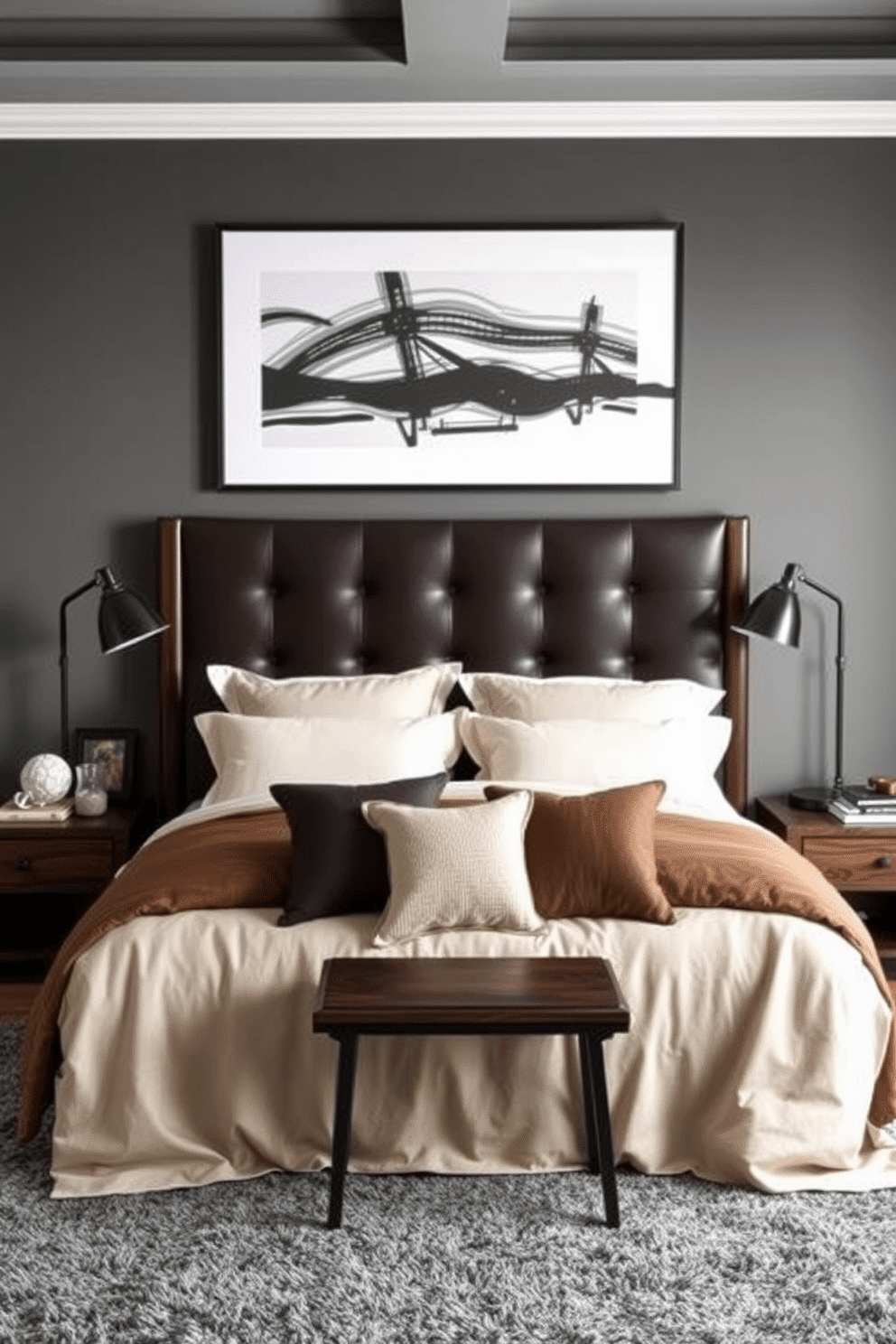 A sleek and masculine bedroom design. The centerpiece is a statement leather headboard in a deep espresso tone, paired with dark walnut side tables and industrial-style lamps that exude sophistication. The walls are painted a soft charcoal grey, complemented by neutral bedding in shades of cream and taupe for a refined contrast. A plush area rug in textured gray anchors the room, while black-and-white artwork above the bed adds an understated, modern edge.