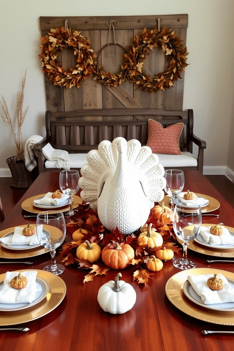 A ceramic turkey centerpiece sits prominently on a beautifully set dining table adorned with autumn leaves and small pumpkins. Surrounding the centerpiece are elegant place settings featuring gold-rimmed plates and crystal glasses, creating a festive atmosphere.