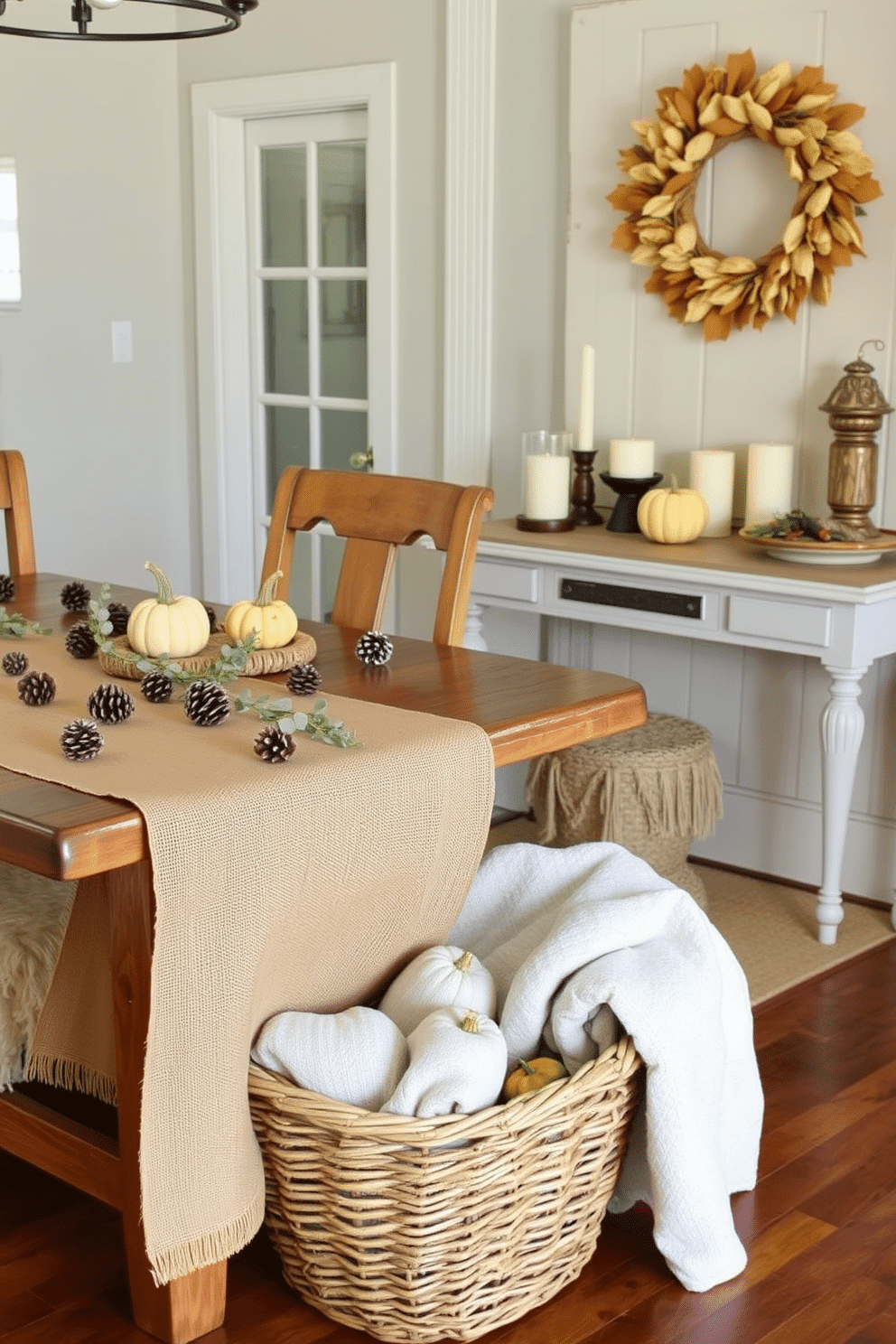 The entryway features a charming console table topped with a seasonal display of gourds and candles. A woven basket filled with cozy blankets sits beneath the table, while a wreath made of dried leaves hangs on the door, welcoming guests with a touch of autumn.
