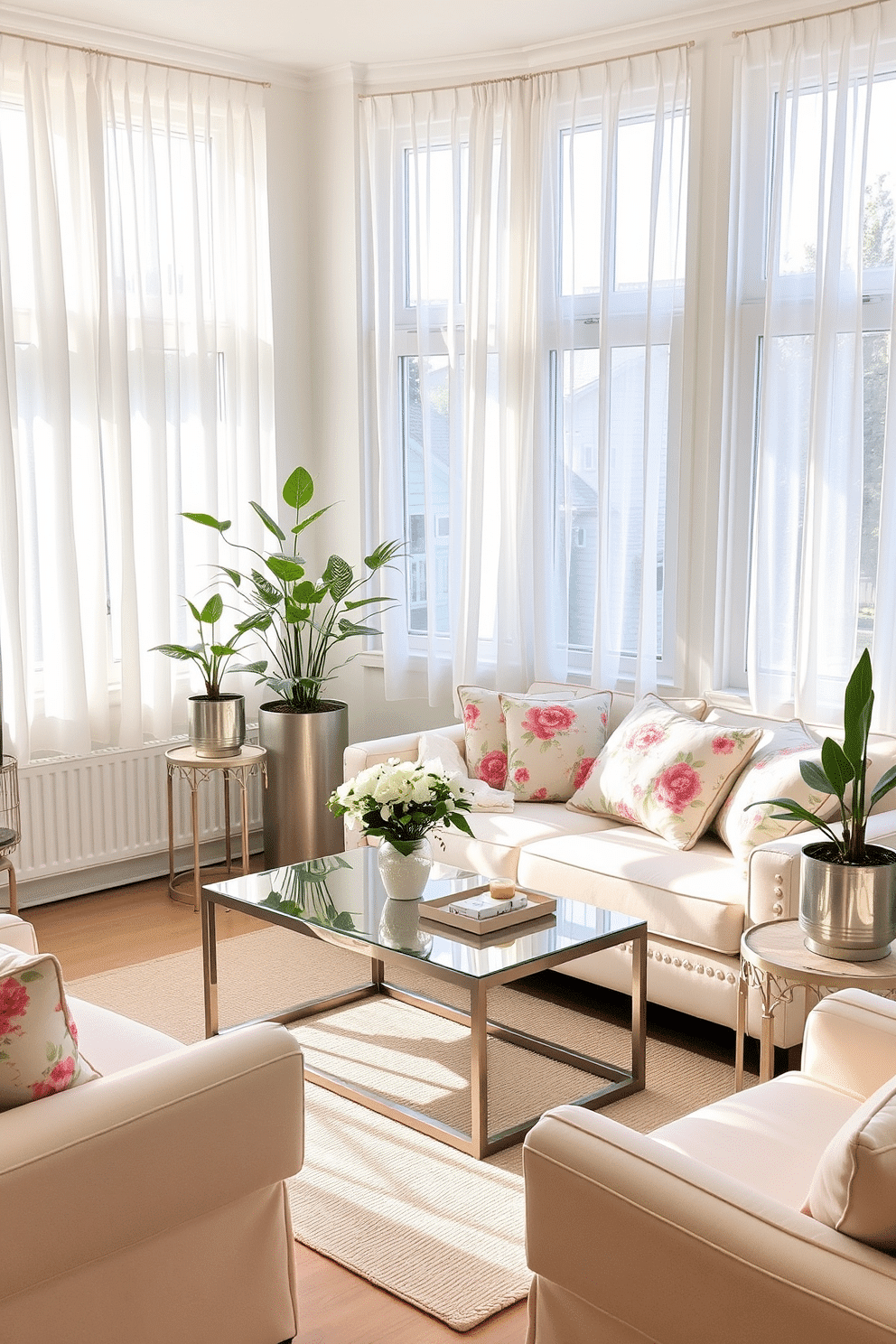 A sleek metallic coffee table sits at the center, reflecting light and adding a touch of elegance. Decorative cushions with floral patterns are scattered on a light-colored sofa, enhancing the cheerful ambiance.
