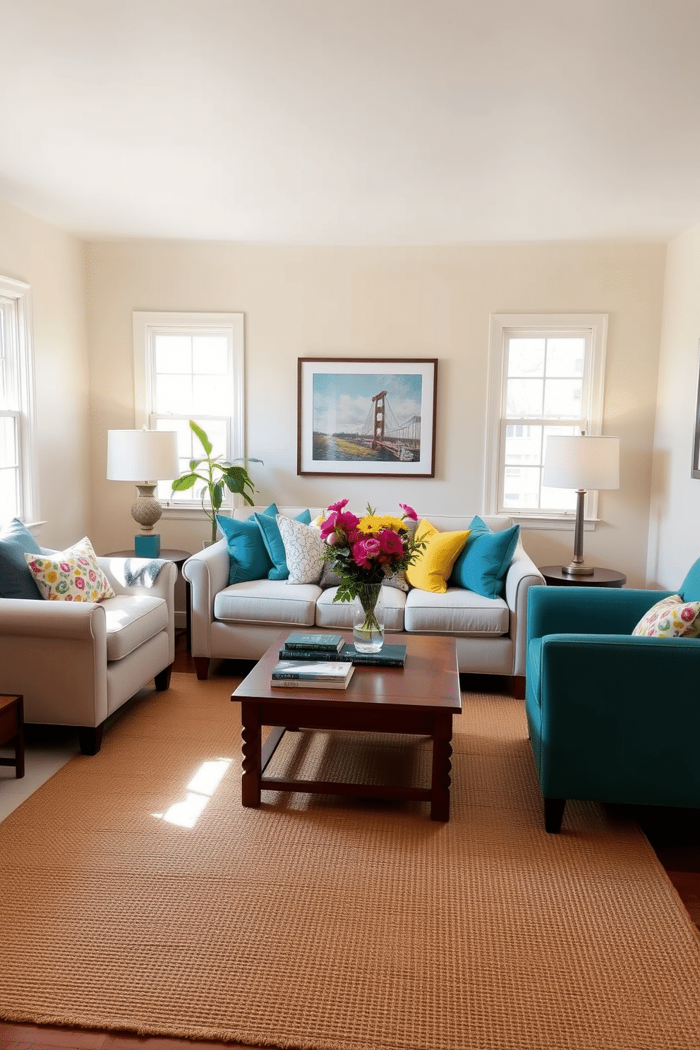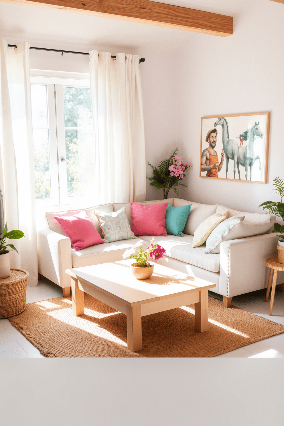 A bright and airy summer small living room features light-colored walls that enhance the natural sunlight streaming through large windows. A cozy seating arrangement includes a plush cream sofa adorned with colorful throw pillows and a woven coffee table at the center.