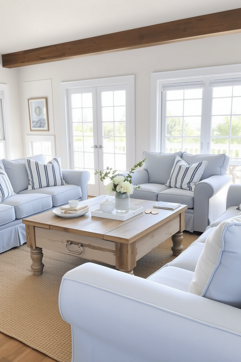 Surrounding the coffee table are soft, plush sofas upholstered in light blue fabric, adorned with white and navy striped cushions. Natural light floods the room through large windows, enhancing the fresh and inviting atmosphere.