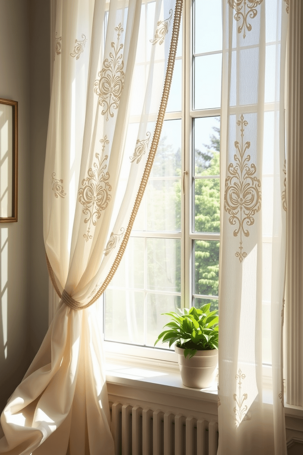 Create a bright and airy summer window display featuring sheer panels adorned with bold embroidery details. The sheer fabric gently filters the sunlight, casting playful shadows across the room while adding a touch of elegance.