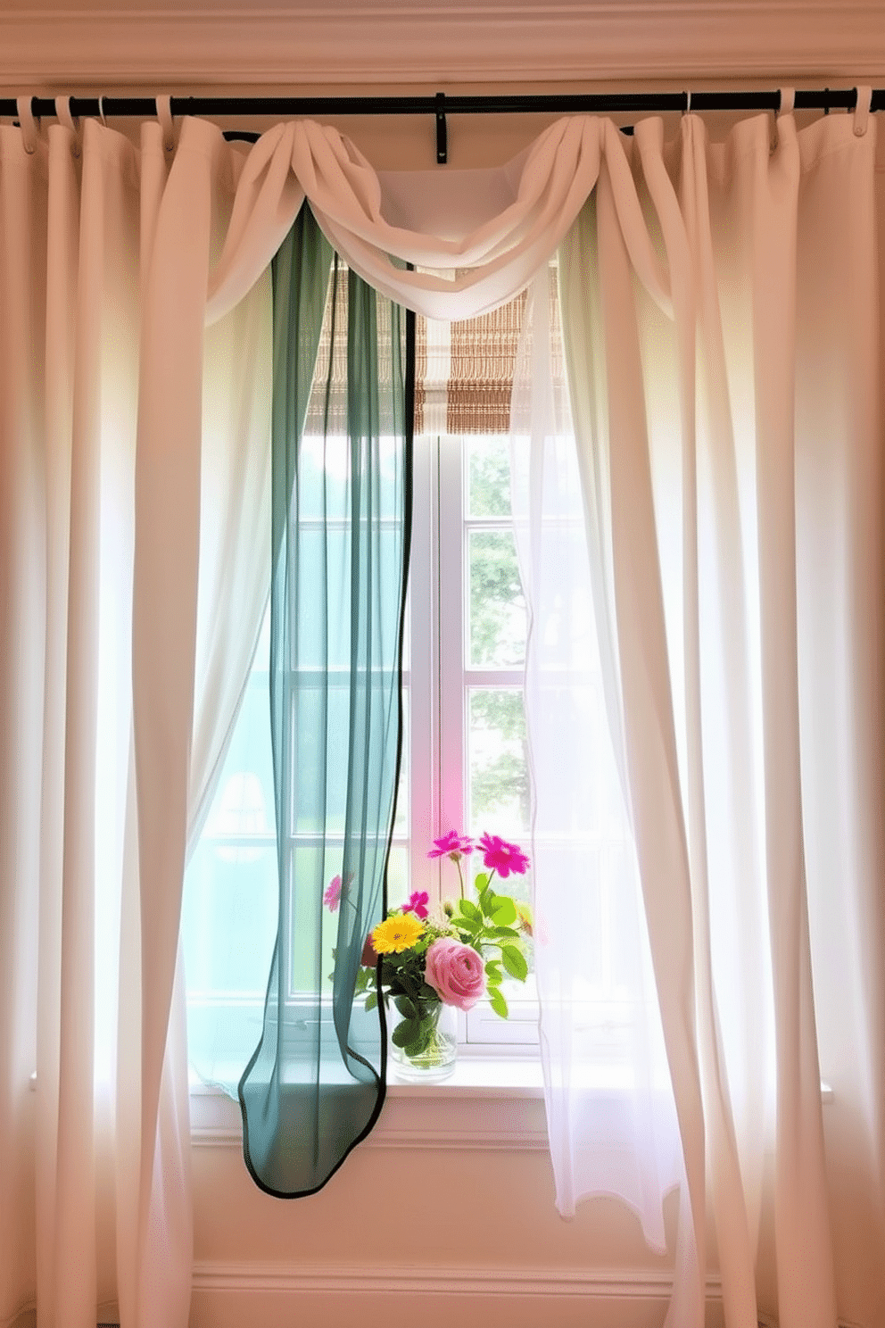 Layered curtains in soft, flowing fabrics create a sense of depth and texture in the room. The curtains feature a combination of sheer and opaque materials that allow natural light to filter through while providing privacy.