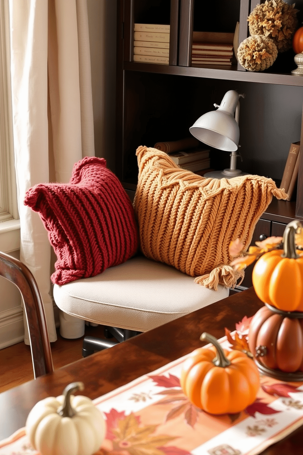 A cozy office chair adorned with soft knit pillows in warm autumn colors creates an inviting workspace. The desk is decorated with seasonal accents like small pumpkins and a festive table runner, enhancing the Thanksgiving spirit.