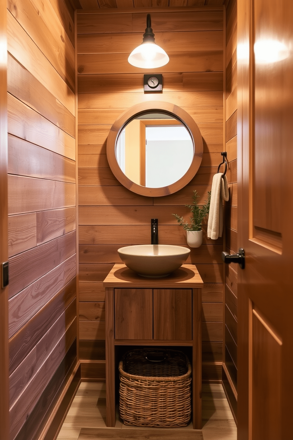A cozy tiny powder room featuring natural wood elements that create a warm and inviting atmosphere. The walls are adorned with reclaimed wood paneling, and a compact wooden vanity with a vessel sink sits against one side.