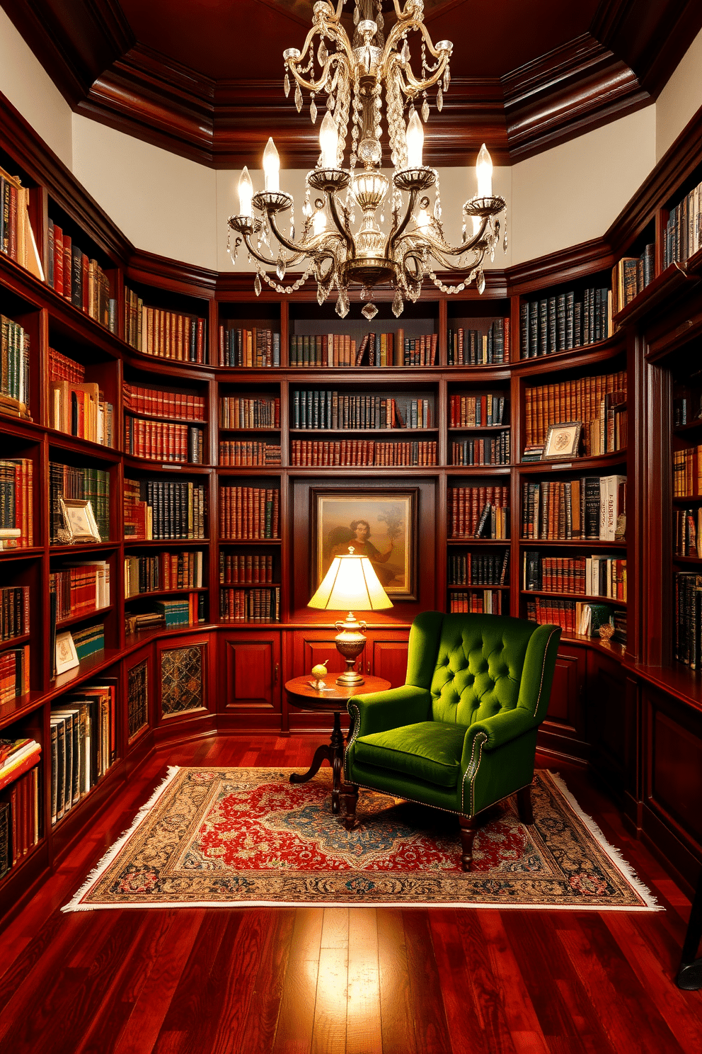 An elegant vintage home library features rich mahogany bookshelves filled with leather-bound books, creating a warm and inviting atmosphere. A plush, deep green velvet armchair sits in the corner, accompanied by a small round table topped with a classic brass lamp, casting a soft glow over the space.