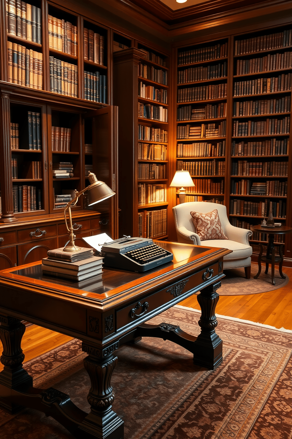 An elegant writing desk made of rich mahogany, showcasing intricate carvings and a polished finish. On the desk, a vintage typewriter sits atop a stack of leather-bound books, accompanied by a brass desk lamp with a soft glow.