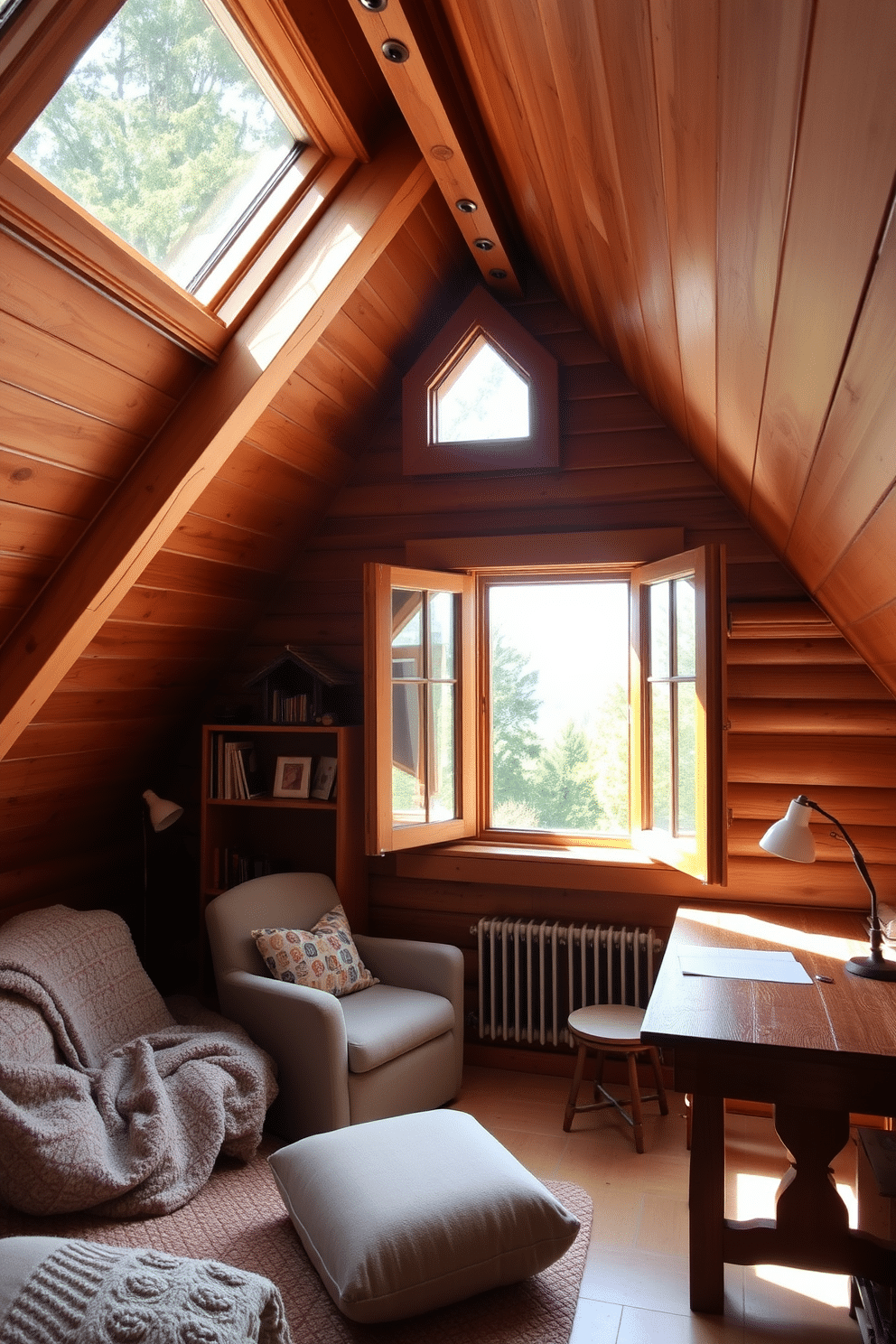 The wooden attic room exudes charm with exposed beams and a sloped ceiling, bathed in soft, natural light. A plush area rug lies beneath a seating area, complemented by a mix of comfortable cushions and a small bookshelf filled with curated reads.