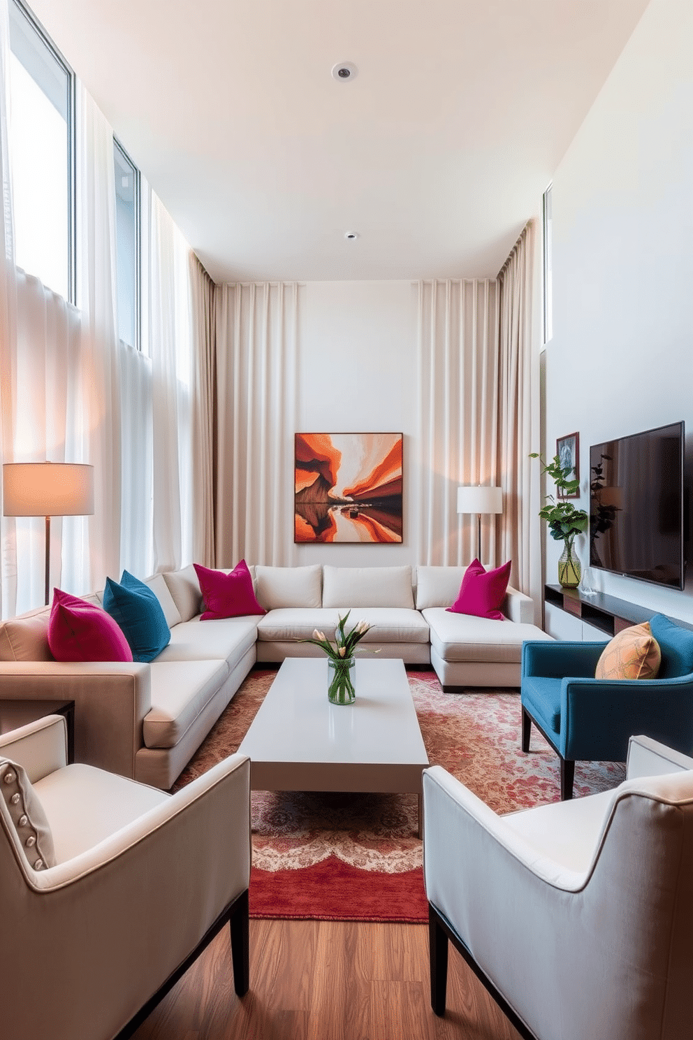 The seating area features a plush sectional sofa in a light neutral tone, complemented by vibrant throw pillows for a pop of color. A sleek coffee table sits at the center, surrounded by stylish accent chairs that enhance the room’s functionality and aesthetic appeal.