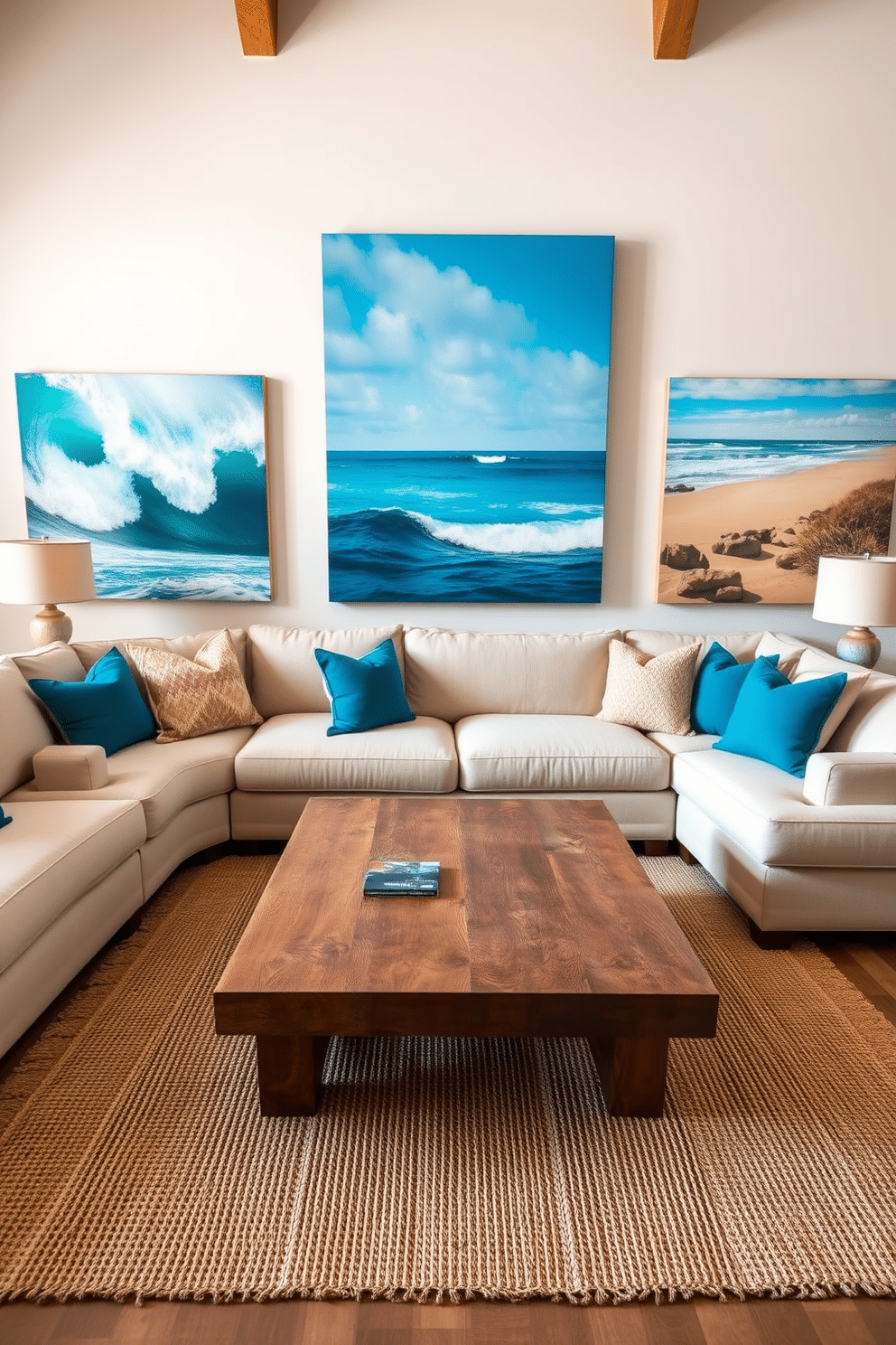 The furniture is arranged for comfort and relaxation, with a plush sectional in soft, sandy tones and accent pillows in ocean blues. A large coffee table made of reclaimed wood sits in the center, surrounded by natural fiber rugs that add warmth to the space.