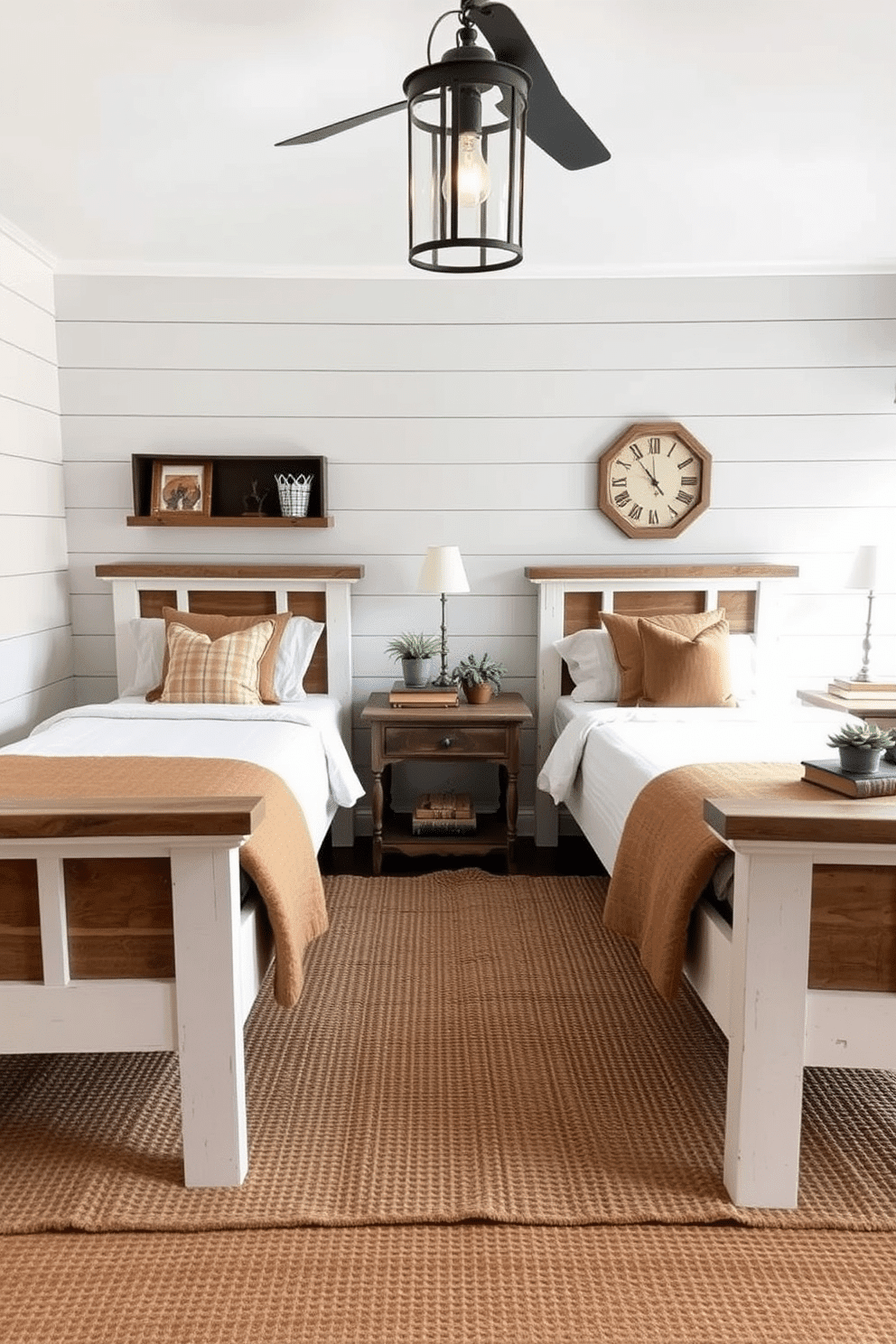 A cozy twin bedroom with a rustic farmhouse vibe features reclaimed wood bed frames painted in a soft white hue, complemented by warm, earthy textiles. A large area rug made from natural fibers anchors the space, while vintage lanterns hang from the ceiling, adding charm and warmth.