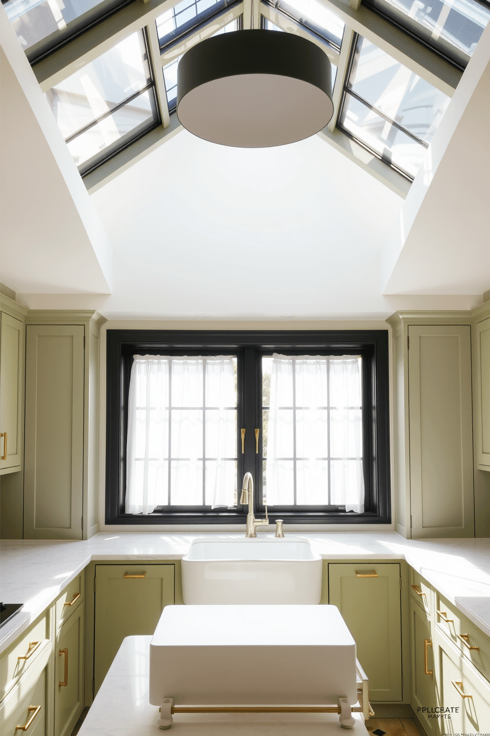 A kitchen filled with natural light streaming through expansive skylight windows, creating a bright and airy atmosphere. The cabinetry is painted in soft sage green, paired with sleek brushed gold hardware, and the countertops are a polished white quartz that reflects the sunlight beautifully.