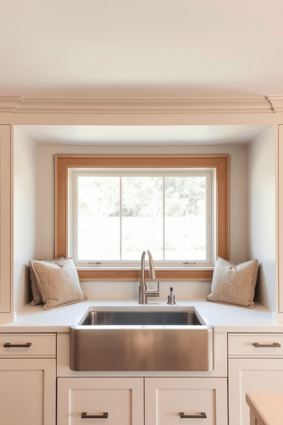 An inspiring kitchen window design featuring a wide, frameless glass pane that invites ample natural light. Above the deep farmhouse sink, the window is framed with subtle wooden molding, perfectly complementing the surrounding cabinetry.