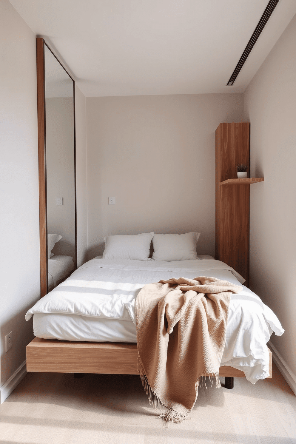 A cozy and compact bedroom designed with functionality in mind. The walls are painted in a soft neutral tone, while a full-length mirror is strategically placed along one side to create the illusion of a larger space and reflect natural light. The bed is dressed in light, airy textures with a throw blanket casually draped at the foot, complemented by a floating nightstand to maintain an open floor area. To further maximize space, a tall, slim wardrobe stands in the corner, and a small potted plant rests on a simple shelf for a subtle pop of greenery.