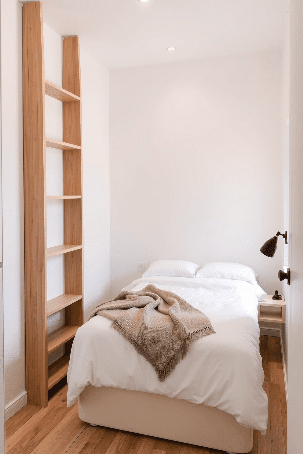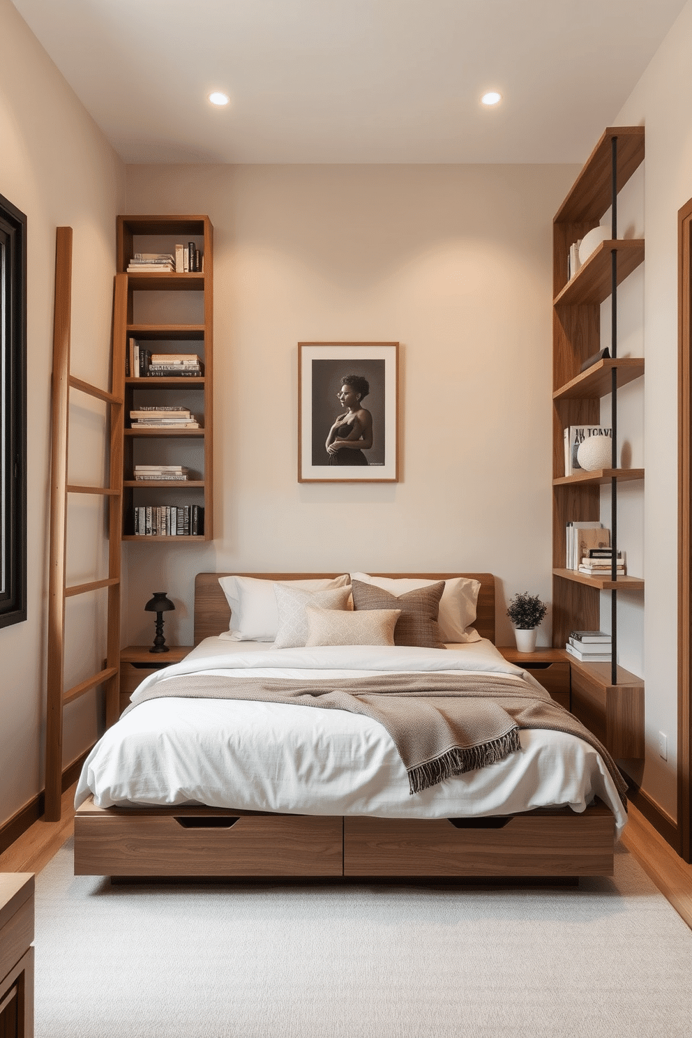 A compact yet efficient bedroom design with vertical shelving to optimize storage in a minimal space. Floating shelves in natural wood tones rise from floor to ceiling along one wall, showcasing books and decorative items, while a sleek ladder provides access to the higher levels. The bed is a low-profile platform style with under-bed drawers for hidden storage, dressed in neutral linens with textured throw pillows. Soft beige walls create a calm ambiance, complemented by a single statement art piece above the headboard and a small potted plant in the corner for a touch of greenery.
