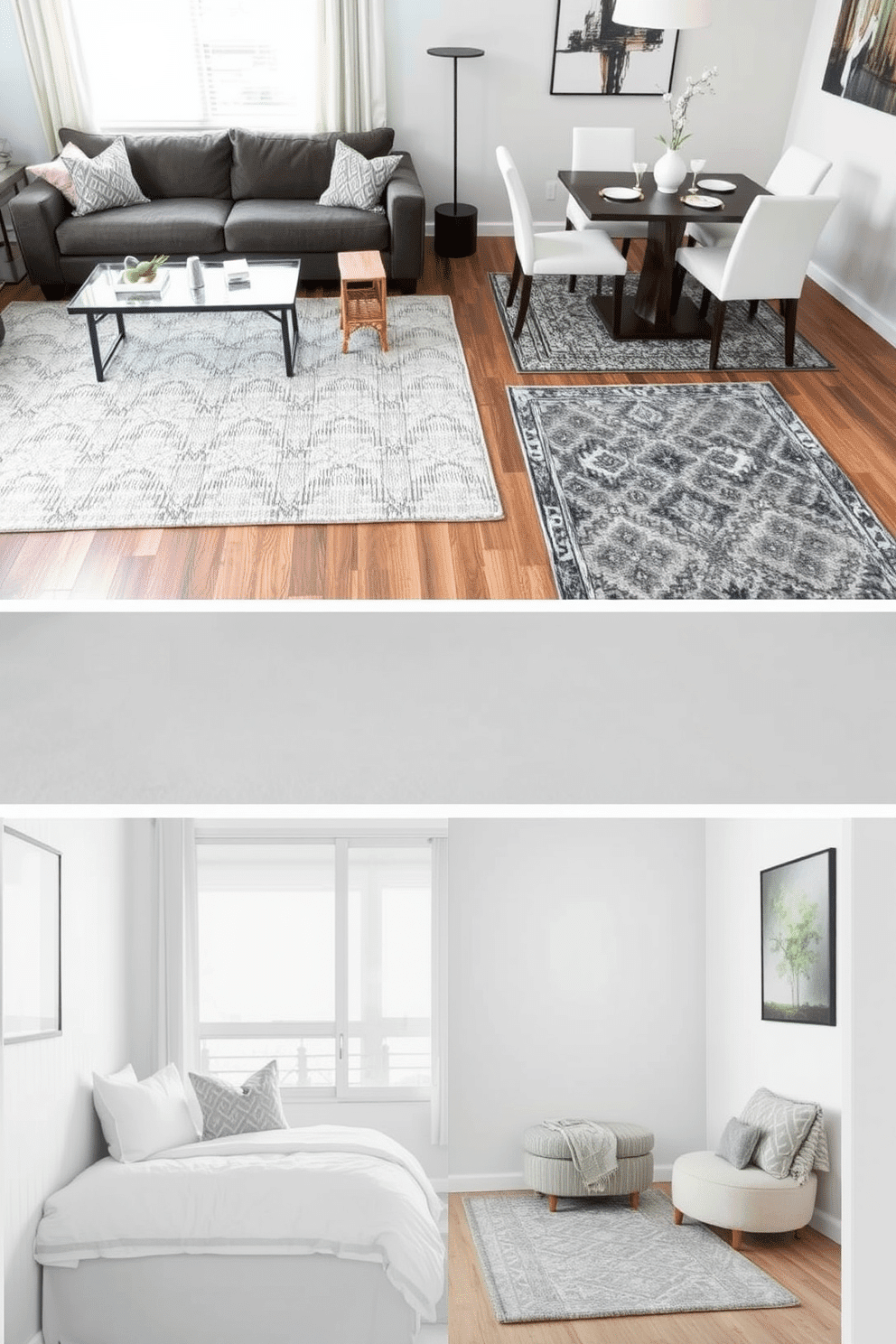 A perfectly zoned living room is created by placing a large, textured area rug under the seating arrangement, defining the space for relaxation and conversation. In the adjacent dining area, a sleek, patterned rug provides a visual boundary while complementing the dining table and chairs. For a compact bedroom, a cozy rug placed just beneath the bed anchors the room and adds warmth. A smaller, complementary rug beside a chair or reading nook creates a secondary focus, making the most of the limited space without overcrowding.