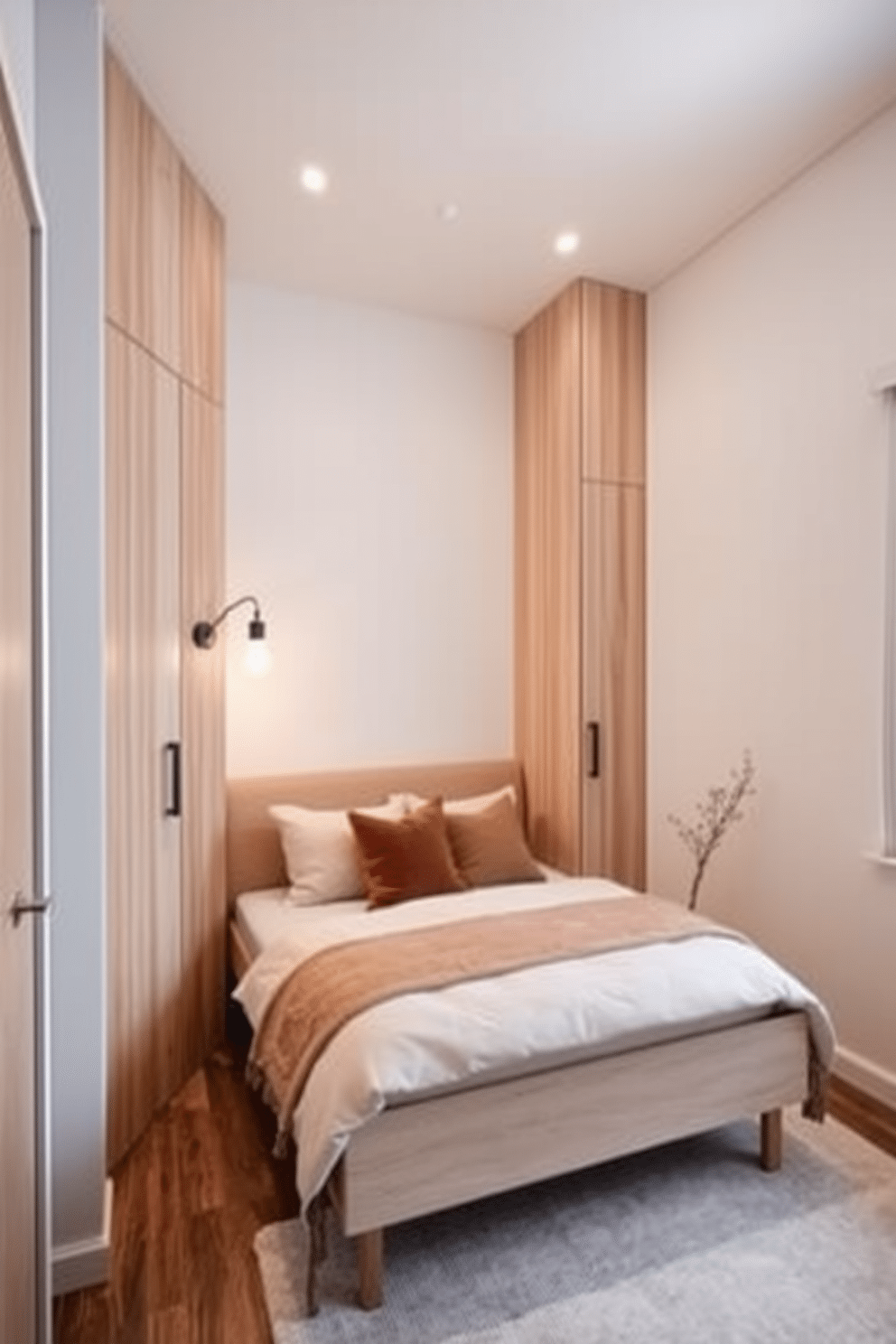 A cozy and functional small bedroom utilizing vertical space effectively. Tall storage cabinets crafted from light-toned wood stretch towards the ceiling, creating a sense of height while providing ample storage without overwhelming the room. The bed, positioned centrally, features a minimalist frame with neutral bedding, complemented by soft accent pillows in earthy tones. A sleek wall-mounted lamp and a delicate plant on the bedside table complete the serene, uncluttered look.