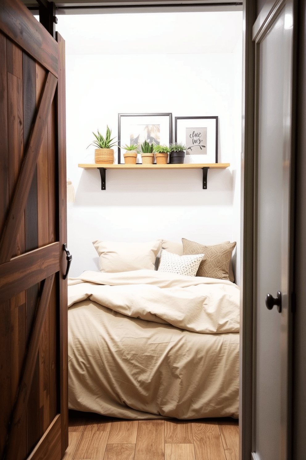 A cozy and compact bedroom with an emphasis on functionality. A sliding barn door with a rustic wood finish saves space and adds charm, separating the room from an adjacent hallway or closet. The bed is pushed against a wall to maximize floor area, draped with soft neutral linens and accent pillows for warmth. Above it, a slim floating shelf holds potted plants and framed art, creating visual interest without clutter.