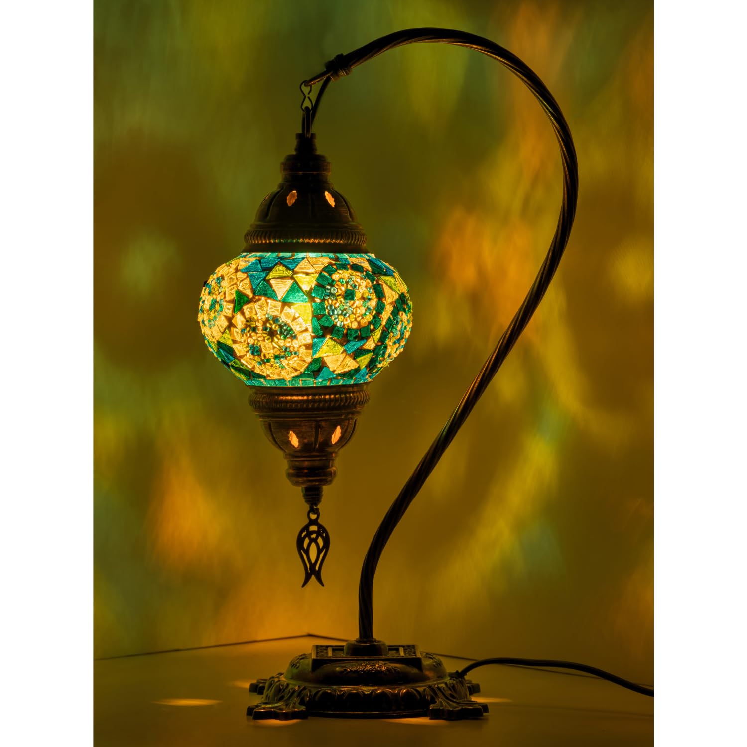 This Kafthan Turkish Swan Neck Lamp is a charming addition to your home. Its vibrant mosaic patterns on the lamp shade bring colorful light to any space. The brass-colored metal base adds to its antique elegance, making it a standout piece.