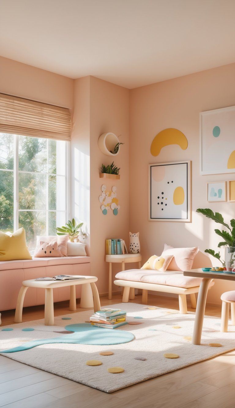 A bright, cozy room with soft pastel and neutral colors, featuring modern furniture, a reading nook with books, art supplies on a small table, and green plants by large windows.
